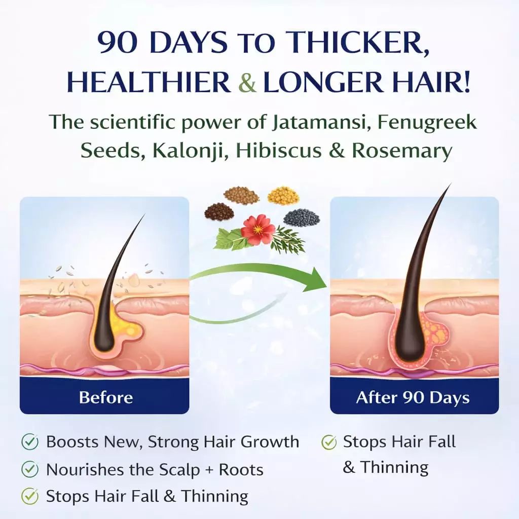 Key Ingredients: Jatamasi, Fenugreek seeds, onion Bhasma, Kalonji Seeds, Rosemary, Hibiscus, ETC. (100% Ayurvedic, chemical-free)